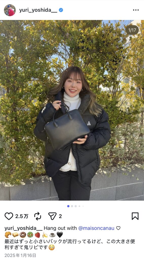 メゾンカナウの愛用者として最も知られているのが、スタイリストの佐藤佳菜子さんです。佐藤さんはメゾンカナウのバッグを複数所有しており、自身のスタイリングにも積極的に取り入れています。さらに、前述の通りmartinique別注のネイビーモデルを監修するなど、ブランドとの深い関わりがあります。